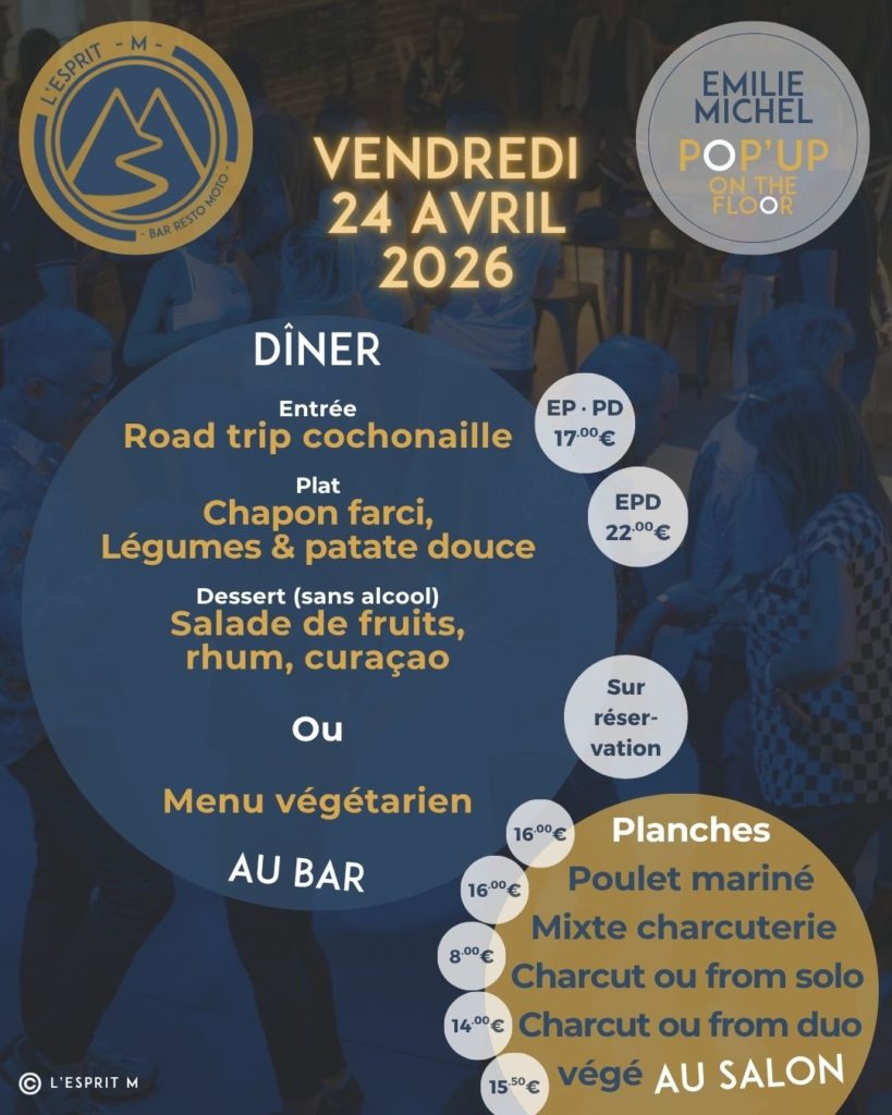 L’équipe de L’Esprit M – Bar Resto moto vous accompagnera tout au long de cette soirée West Coast Swing à Valence. Côté boissons, en plus la carte habituelle (bières locales, vins locaux, cocktails et mocktails maison, soft sélectionnés avec soin), nous vous concocterons cocktails et mocktails. Côté petites faims, Christophe notre chef nous proposera des nos fameuses planches de spécialités régionales (charcuterie, fromages, mixtes, végés, poulet). Pour finir sur une note sucrée, vous pourrez découvrir notre brownie maison, si le cœur vous en dit !
